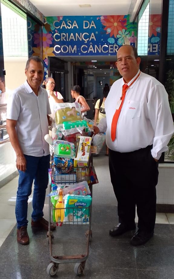 Representando o CRF-BA, o Dr. Arivaldo Santana, assessor da diretoria, entregou fraldas e brinquedos ao colaborador Joelson da Silva.