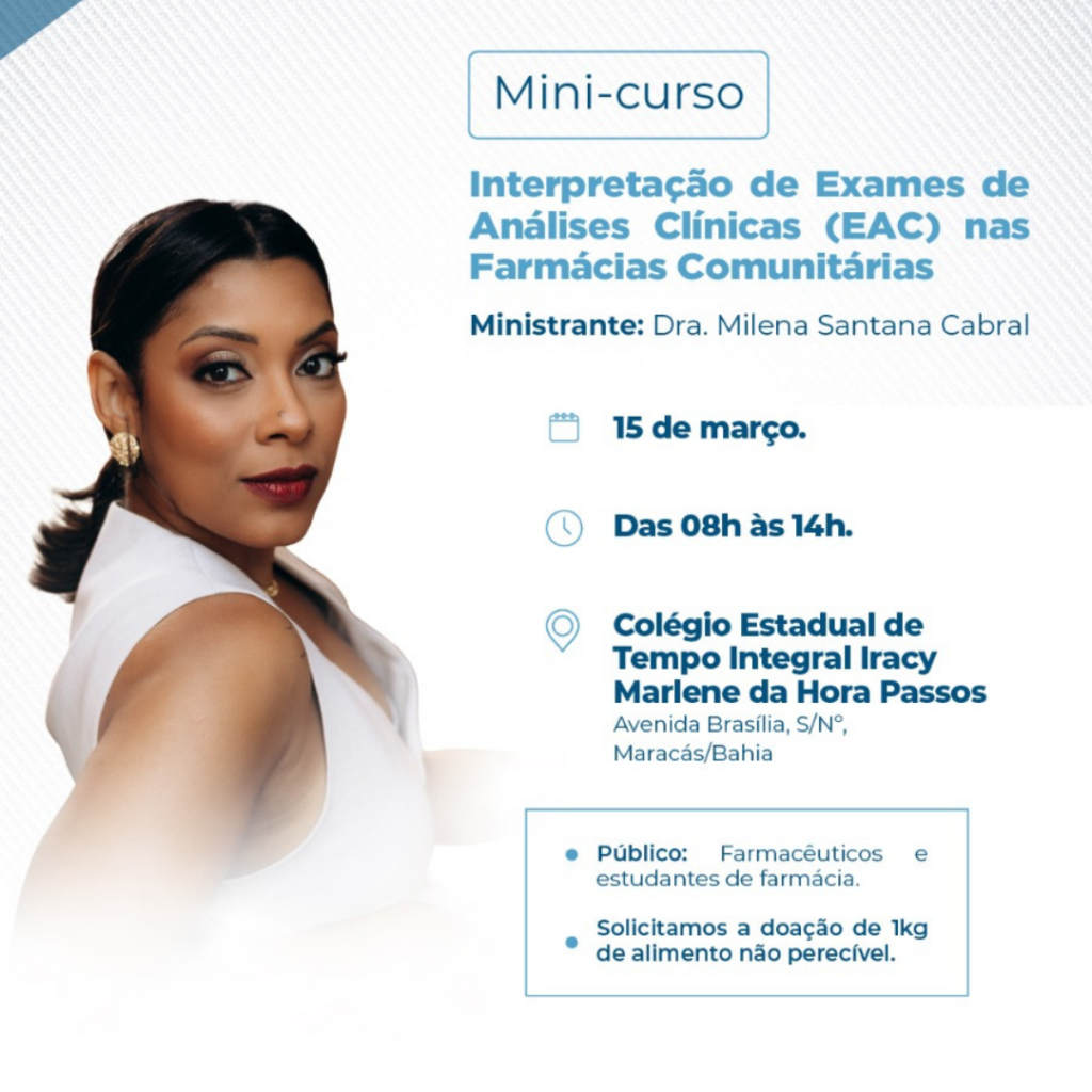 O CRF-BA convida farmacêuticos e estudantes de Farmácia de Maracás e região para participar do mini-curso gratuito de tema “Interpretação de Exames de Análises Clínicas (EAC) nas Farmácias Comunitárias“, dia 15 de março, das 8h às 14h. O conteúdo será ministrado pela Dra. Milena Santana Cabral no Colégio Estadual de Tempo Integral Iracy Marlene da Hora Passos.