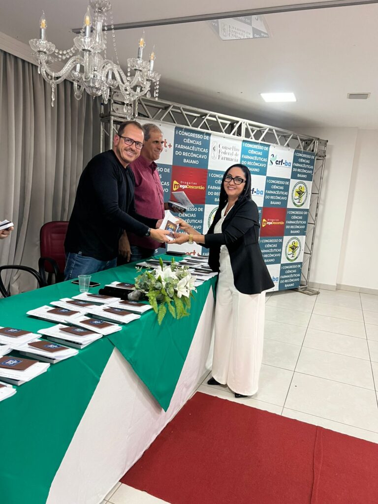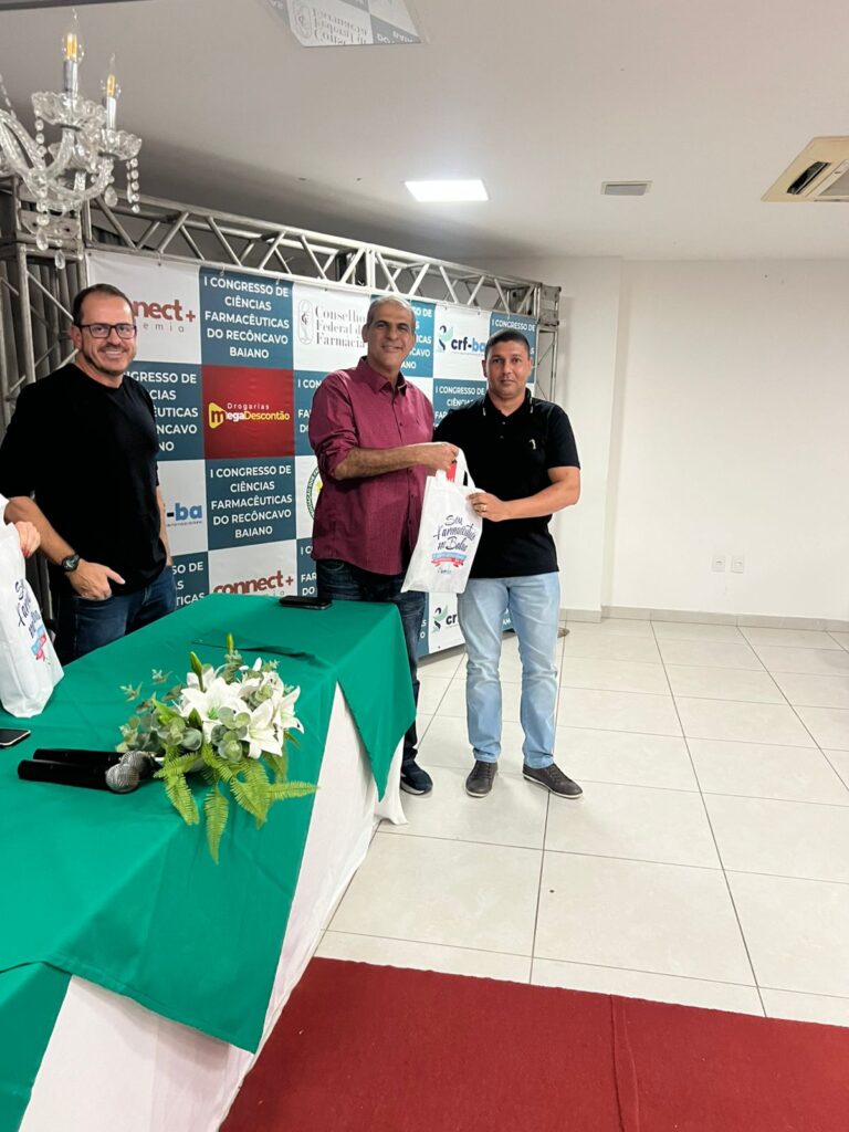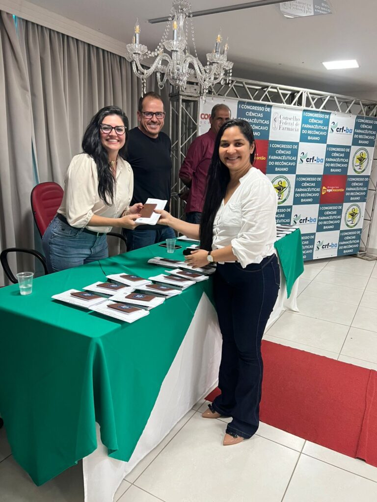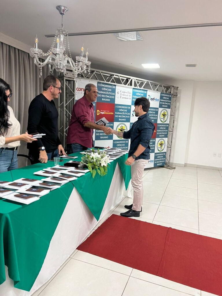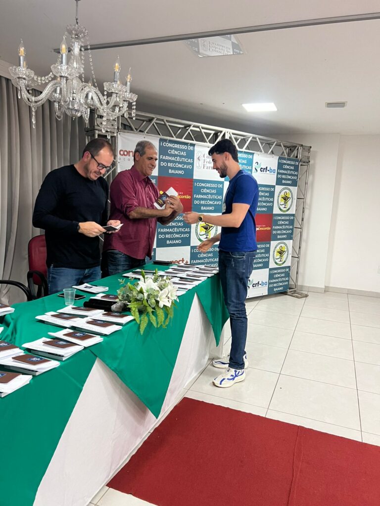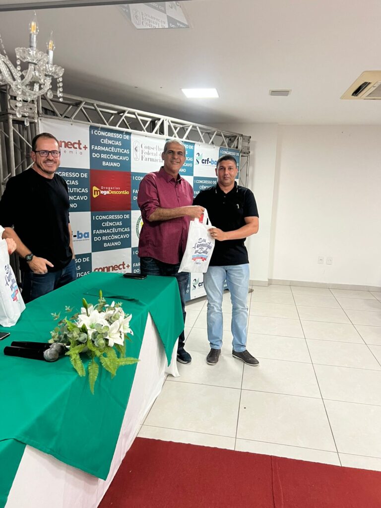 A mesa de abertura contou com a presença de Dr. Mário Martinelli, presidente do CRF-BA; Dr. Altamiro José, conselheiro federal de Farmácia; e Dra. Maiana Sarmento, presidente da Associação dos Farmacêuticos do Recôncavo Baiano (Asfarb)