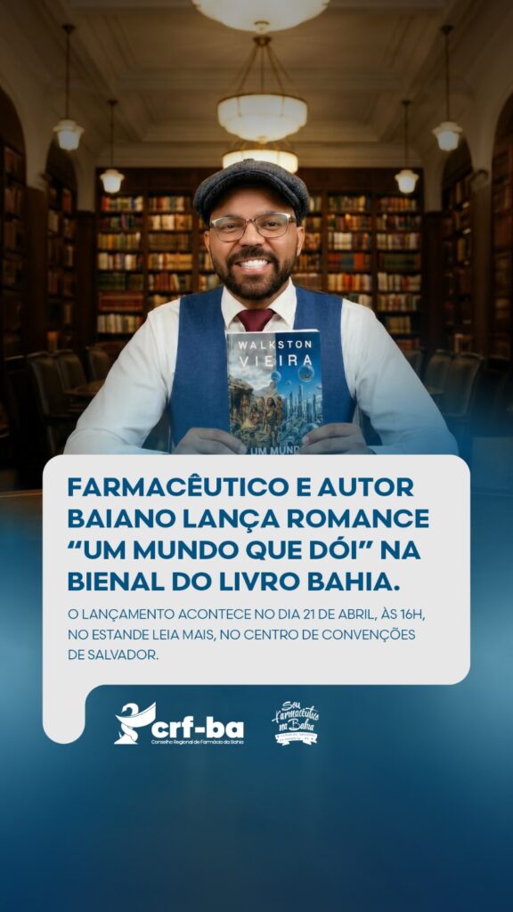 O CRF-BA tem a satisfação de divulgar o lançamento do novo romance do colega farmacêutico Dr. Walkston Vieira, intitulado “Um Mundo que Dói”. A obra será apresentada durante a Bienal do Livro Bahia 2026, no Centro de Convenções de Salvador, no dia 21 de abril, às 16h, no estande “Leia Mais”.