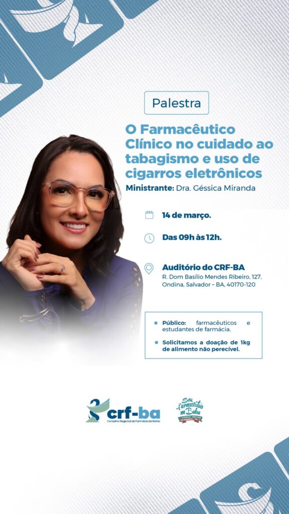 O CRF-BA realizará, no dia 14 de março, das 9h às 12h, a palestra “O Farmacêutico Clínico no cuidado ao tabagismo e uso de cigarros eletrônicos”. Ministrado pela Dra. Géssica Miranda, o evento gratuito ocorrerá na sede do CRF-BA, no bairro de Ondina, na capital baiana e é voltado para farmacêuticos e estudantes de farmácia. O CRF-BA solicita do participante apenas a doação de 1kg de alimento não perecível.