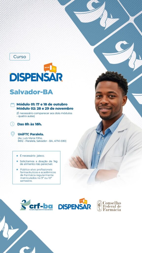 O curso Dispensar, promovido pelo Conselho Federal de Farmácia, chega a Salvador com dois encontros presenciais voltados para farmacêuticos e acadêmicos do 9º e 10º semestre de Farmácia. A capacitação tem como foco a qualificação da dispensação de medicamentos nas farmácias comunitárias, fortalecendo o papel clínico do farmacêutico no cuidado à saúde.