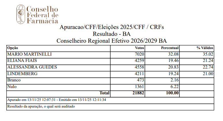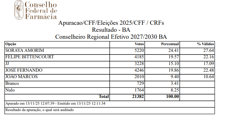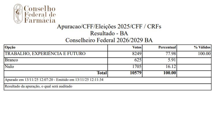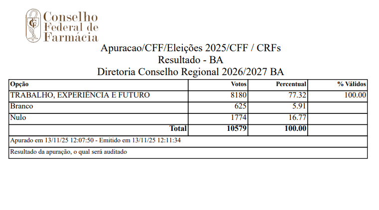 O CRF-BA torna público o relatório com o resultado da Eleição de 2025 para escolher Conselheiros e Diretoria.