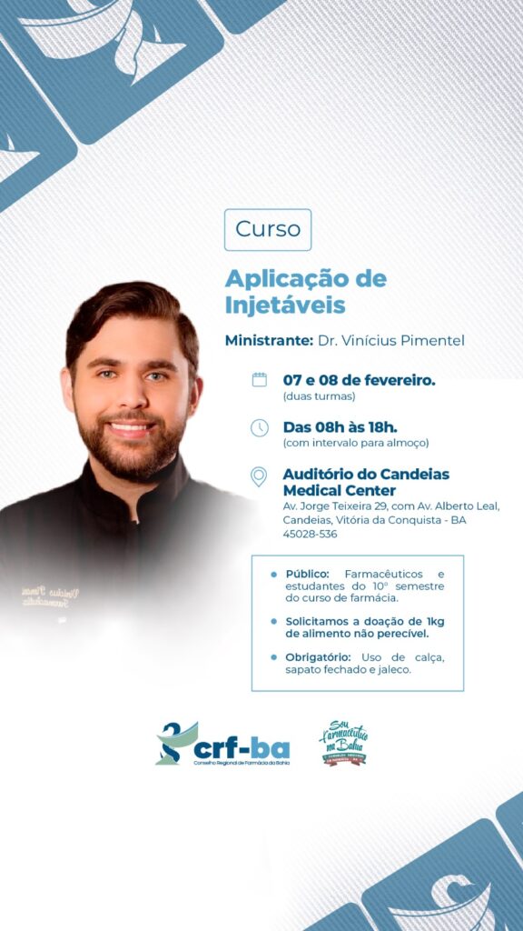 O CRF-BA realizará, nos dias 07 e 08 de fevereiro, duas turmas do curso gratuito de Aplicação de Injetáveis, na cidade de Vitória da Conquista. A capacitação será ministrada pelo Dr. Vinícius Pimentel, das 8h às 18h, no auditório do Candeias Medical Center (localizado na Av. Jorge Teixeira, 29 – Candeias, Vitória da Conquista – BA, 45028-536).